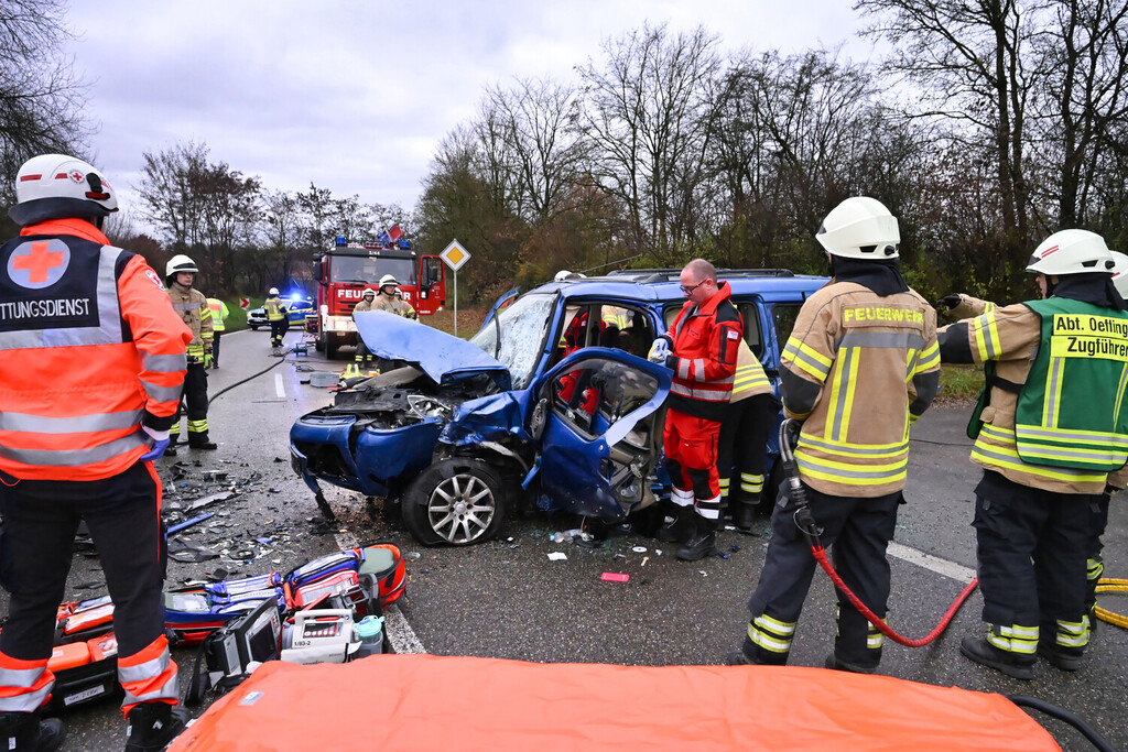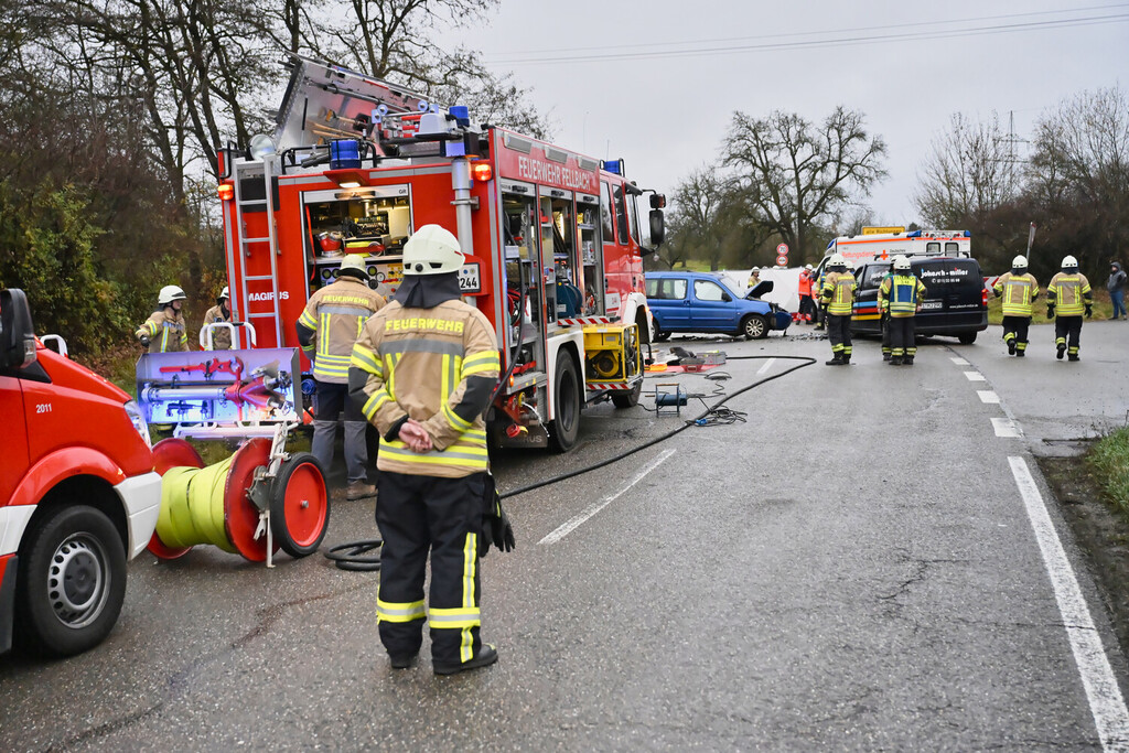 Auf der L1197 ereignete sich in Fahrtrichtung Remseck ein schwerer Verkehrsunfall, bei welchem zwei Fahrzeuge frontal miteinander zusammengestoßen sind und eine Person im PKW eingeklemmt wurde.